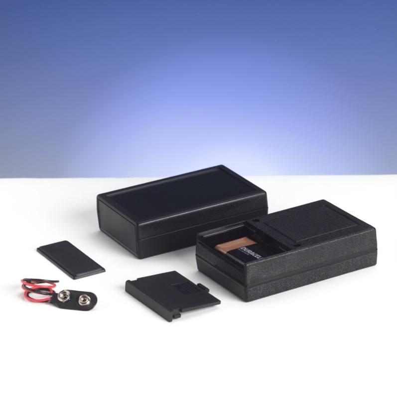 ABS enclosure, 3.8 x 2.4 x 1.5" 9-volt battery compartment, flush/Recessed top, black/Bone. Screws and ABS end-plate.
