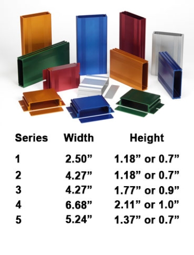 Versatile anodized extruded aluminum enclosure with integral card slots in four profiles and a range of standard lengths. Optional rubber end caps, sealing kits, DIN brackets, DIN mounts and mounting flanges available.