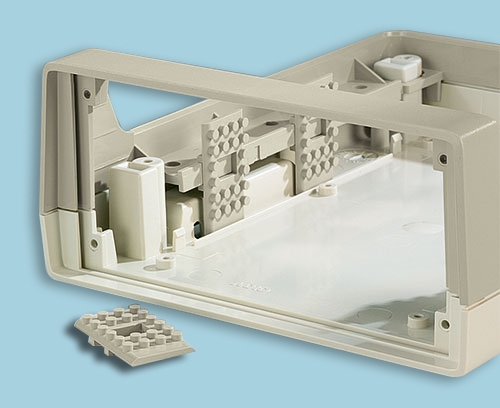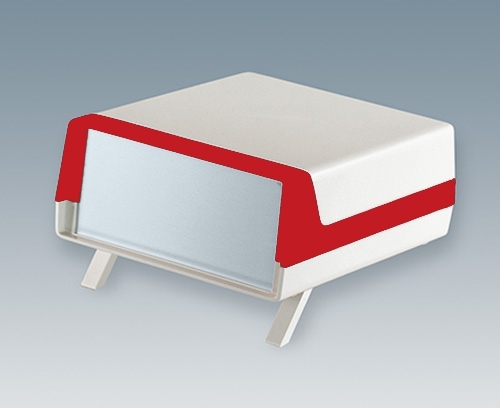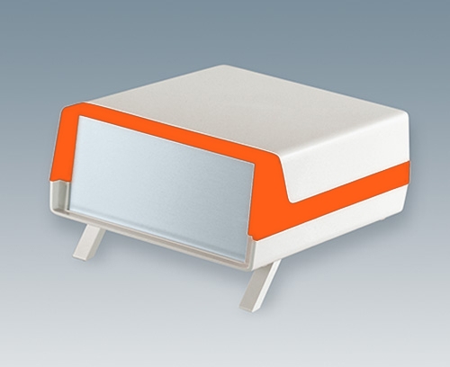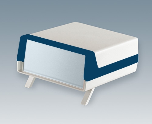 Electronic enclosure with a fine textured finish. The three-part snap together design can also be additionally secured with screws. PCB mounting bosses are located on top and bottom of enclosure. The front plate can slide in or can be screwed onto the front of the enclosure. Tilt feet provide the proper viewing angle.